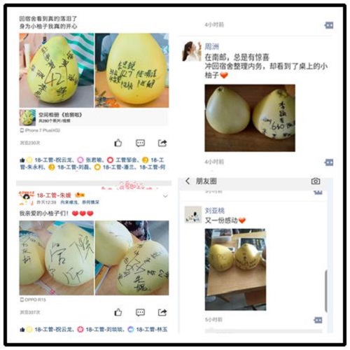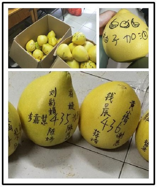9月19日中午,当同学们结束上午的训练,拖着疲惫的身躯返回宿舍打开门时,两颗在桌子上摆放整齐的柚子登时引入眼帘,带给大家无限的惊喜与慰藉。只见一颗柚子上或写着“管院是你永远的家”,或写着“管院爱你”,或写着“管院为你加油”,另一颗柚子上则写上了宿舍号及全体宿舍成员的姓名。这两颗柚子饱含了002全讯白菜官方网站对全体“新柚子”们的关心与鼓舞,让大家在严酷的军训生活中感受到了学院“家”的温暖。