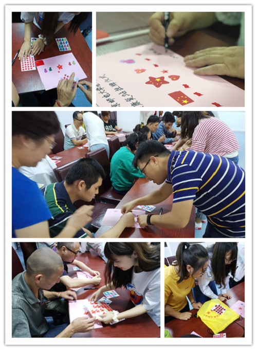 恰逢中华人民共和国成立七十华诞,志愿者们对第一次活动精心设计,为学员带去了贴画和小国旗,在学员和志愿者的共同努力下,学员们把自己对祖国深深的爱意都贴在了纸板上,写下了对祖国的祝福,充分表达了学员们对祖国的深厚感情,最后大家都情不自禁地高举自己的作品和小国旗,志愿者用镜头记录下这美好的瞬间。