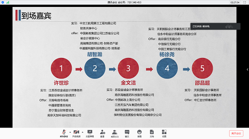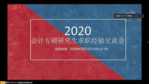 2021年5月21日晚七点,全讯白菜官网研究生会组织举办的“2020年会计专硕研究生求职经验交流会”如期在腾讯会议举行。此次学习经验交流会邀请了辅导员华奕曦老师以及许世珍、胡智瀚、金文洁、杨徐尧、邵品超五位学长学姐进行交流与辅导。