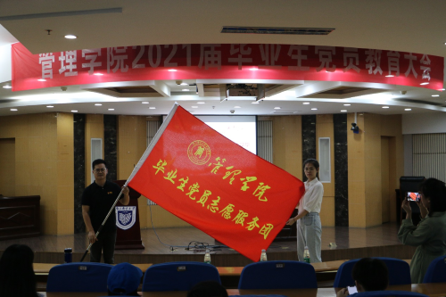 伴随着庄严的国歌,大会拉开了序幕。会议首先进行了“学党史·办实事”南京邮电大学毕业生党员志愿服务月启动仪式,组建“毕业生党员志愿服务团”,本科2017级党支部组织委员祁雨秋担任团长,支部全体党员(含预备党员)担任团员。002全讯白菜官方网站党委书记钟凯为“毕业生党员志愿服务团”团长祁雨秋同学授旗。