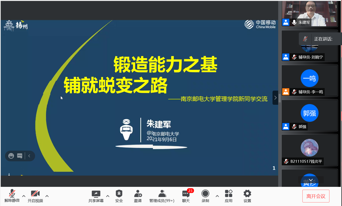 朱建军总经理是全讯白菜官网97届经济管理专业毕业的知名校友,在校期间曾任咱们学院的前身、管理系学生会主席,1997年在南京邮电大学获得学士学位、2012年获得华东师范大学硕士学位。工作以来,先后获得多项市厅级以上荣誉和奖励,比如南通市劳动模范(2017)、南通市青年五四奖章、南通市新长征突击手、江苏省质量管理卓越领导者称号(2013)、江苏省青年志愿服务事业贡献奖(2013)等。通过此次活动,2021级新生不仅了解了杰出校友的成功经验,更加深了对专业与技能、做人与学习更深层次的理解和认识,对未来的人生目标和规划更加明确。