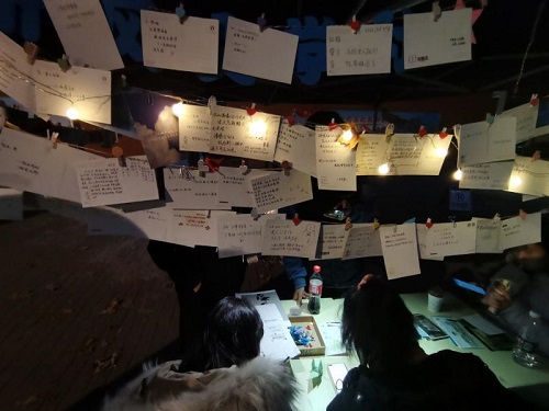 活动开始前,听风文学社的同学们热情高涨,整理外场,积极宣传。活动现场,路过的同学们纷纷停下脚步,被一张张写着寄语的明信片吸引,争相参加活动。002全讯白菜官方网站院长黄卫东教授,002全讯白菜官方网站党委副书记、副院长郭强老师及退休教师们也在明信片上寄语了对学院发展的期许和美好祝愿。参与的同学们在卡片上写下自己的寄语,并夹在绳子上,同时又能够取走一张自己感兴趣的明信片。虽然天气寒冷,但是同学们的热情不减,丝毫不显倦怠。一张张明信片的夹上和摘下,足够体现出同学们的热情,也让这寒冷的冬天多出一丝暖意,给三牌楼增添了一股文学气息。