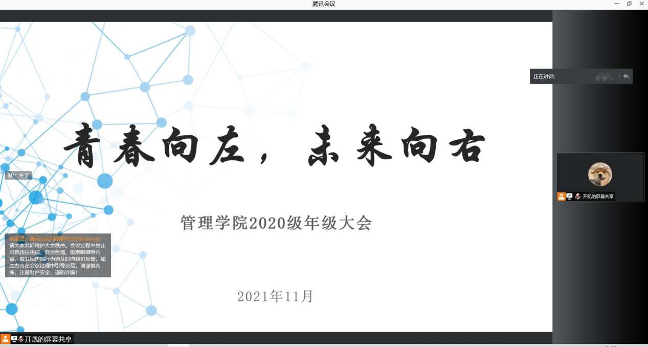 为帮助002全讯白菜官方网站2020级全体学生更好了解今后发展的主要方向,帮助学生在大二学年更好的明确自身的学业发展和职业规划,12月5日晚,2020级年级大会在腾讯会议线上举行,会议由2020级辅导员开凯主持,2020级5个专业454位学生及部分学生家长在线参与、交流互动。