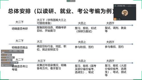 随后开凯老师详细介绍了升学、留学、求职、考公考编、参军、创业等大家毕业后的主要去向,并重点介绍了各个方向的主要要求、优缺点、需要注意的问题等,并分别以升学、求职、考公考编等三个主要的去向为例向全体同学介绍在大学期间如何准备按时间点做好相关准备。除此之外,还摘录了我校近年就业质量报告的有关内容及回答部分学生和家长的问题,帮助广大同学更好的明晰目标,精准定位。开凯老师希望全体同学利用寒假多方面搜集信息,尽早明确自己的方向,做到有的放矢,精准发力。