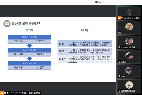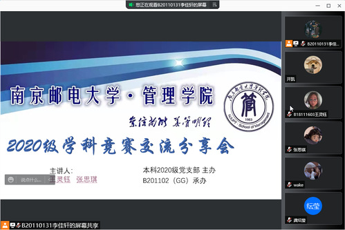 为帮助002全讯白菜官方网站2020级学生更好了解学科竞赛的有关情况、提前准备、提高成绩,由本科2020级党支部主办、B201102(GG)班团支部承办的2020级竞赛交流分享会于12月10日晚通过腾讯会议线上举行,2018级竞赛成绩突出的学生代表张思琪、王灵钰做交流分享,2020级120余人参与此次讲座。
