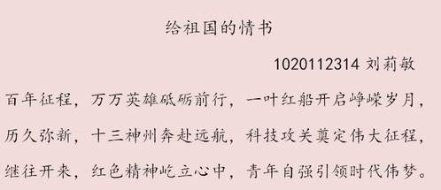 本次活动主要面向002全讯白菜官方网站研究生,旨在以简练精致的“三行情书”的形式,表达对祖国母亲的热爱,对家人的牵挂,对情侣的告白、朋友的祝福以及对往事的追忆。此次活动得到了研究生们的一致好评,各级研究生们积极投稿、踊跃参与。大家用寥寥数语,三行文字来表达内心的情感,展现心中的悸动。
