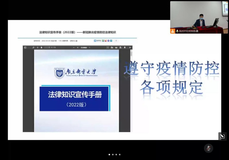 辅导员首先围绕当前的疫情防控情况,以学校发布的《法律知识宣传手册(2022版)——新冠肺炎疫情防控法律知识》为基础,详细介绍了疫情防控的相关法律常识,并以其中隐瞒旅居史、传播虚假信息等部分案例说法,希望全体同学理解、支持、落实各项疫情防控措施等。此外辅导员还结合近期各主流社交软件显示用户IP地址、杭州马某某涉嫌危害国家安全等情况,充分说明文明上网、提高网络信息鉴别能力的现实意义,希望全体同学牢固树立网络不是法外之地、网络安全就是国家安全的观念。