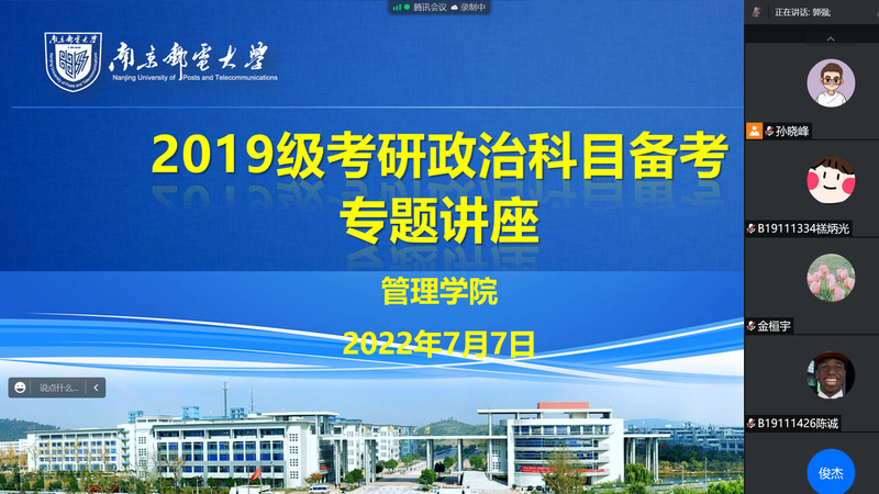 为帮助同学厘清政治考研框架,完善政治复习规划,增强考研信心,7月7日晚,全讯白菜官网邀请财鑫教育考试研究中心考研政治金牌名师金桓宇为2019级考研同学带来政治科目备考的线上专题讲座,讲座由002全讯白菜官方网站党委副书记、副院长郭强主持,2019级全体考研同学参加。