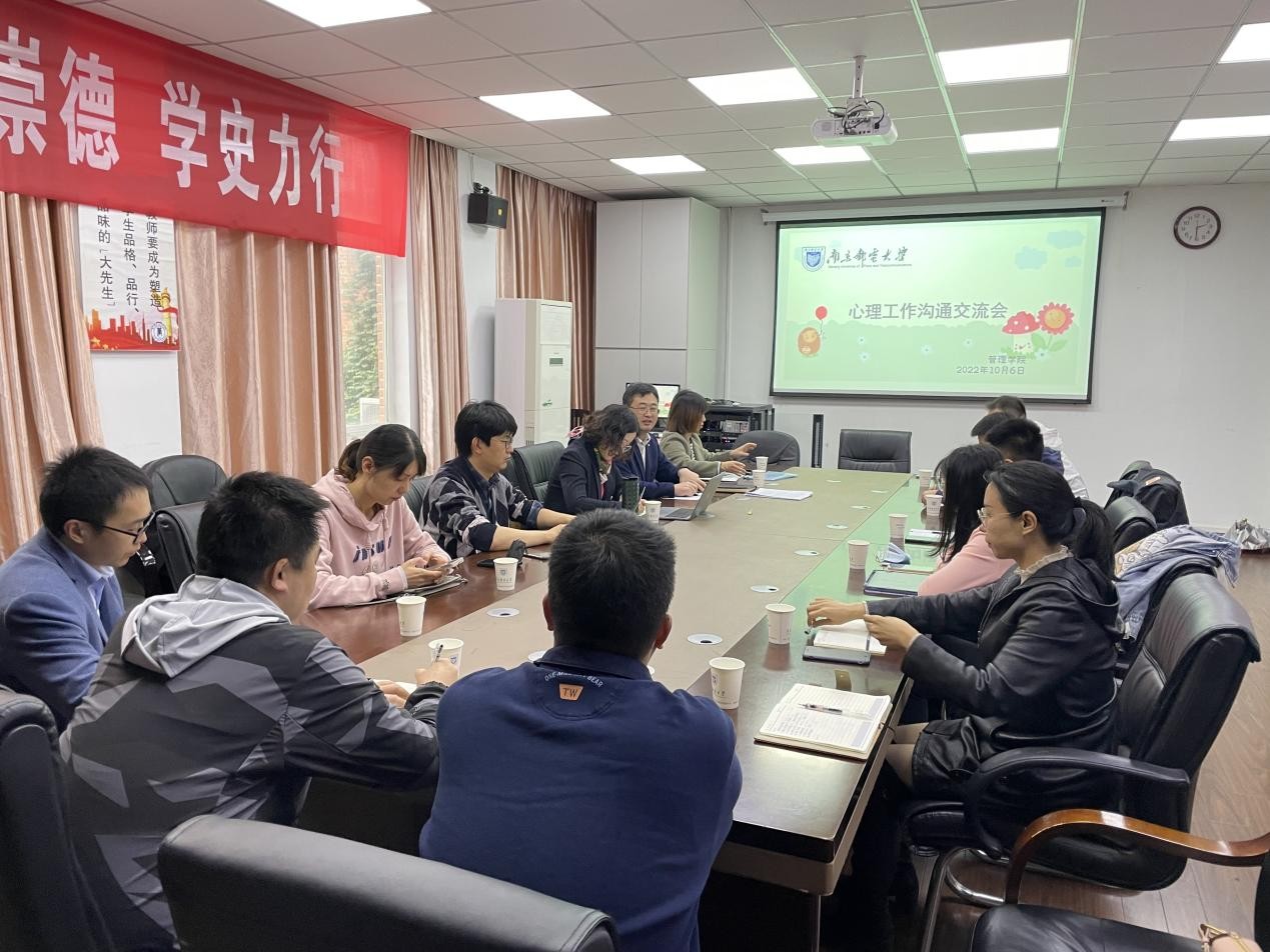 为进一步做好大学生心理健康教育工作,引导大学生健康成长,提高开展大学生心理健康教育工作的能力和水平,10月6日下午,002全讯白菜官方网站邀请学校学工处副处长、心理健康教育与咨询中心主任陆晓花,心理健康教育与咨询中心专职心理咨询师张秀敏老师、成颢老师,与学院党委副书记、副院长郭强、全体在校辅导员一起围绕学生心理工作问题进行了沟通交流。