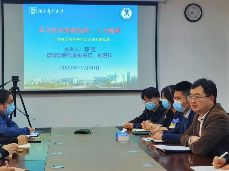 为在学生群体中及时宣传贯彻党的二十大精神,进一步激发青年大学生坚定理想信念,10月30日上午,学院党委副书记郭强在有线楼306会议室为本科2020级党支部讲授主题为“学习贯彻党的二十大精神、为学院发展贡献青年力量”的专题党课,党课由党支部书记开凯主持,根据疫情防控要求,支部全体党员、发展对象参加专题党课学习。
