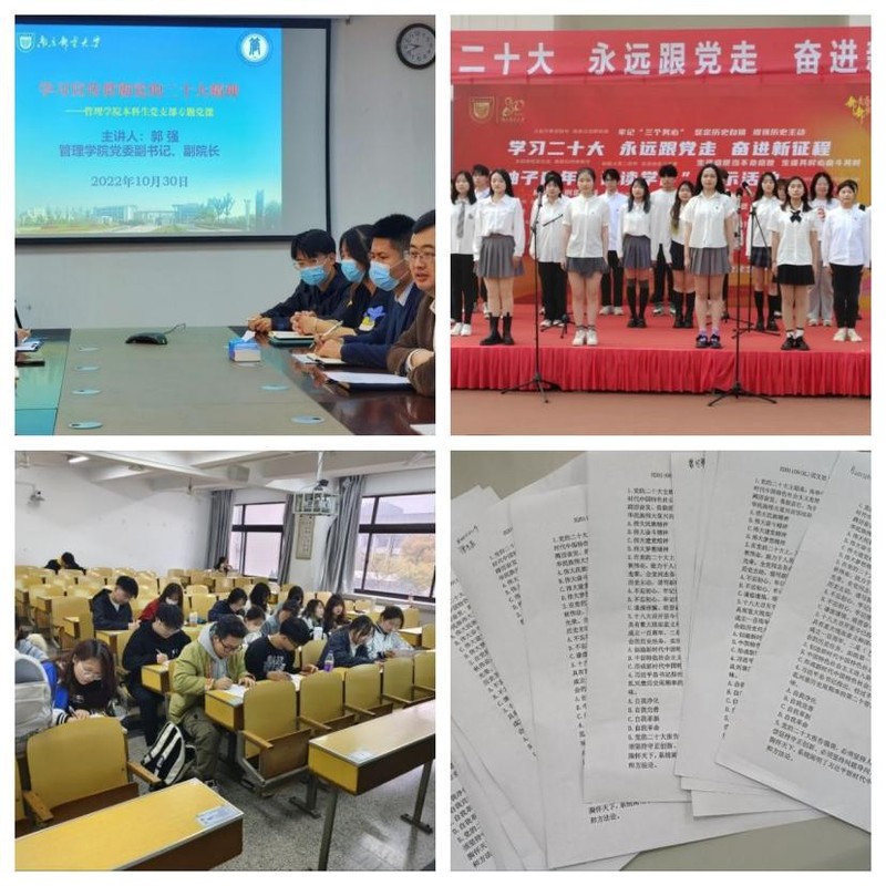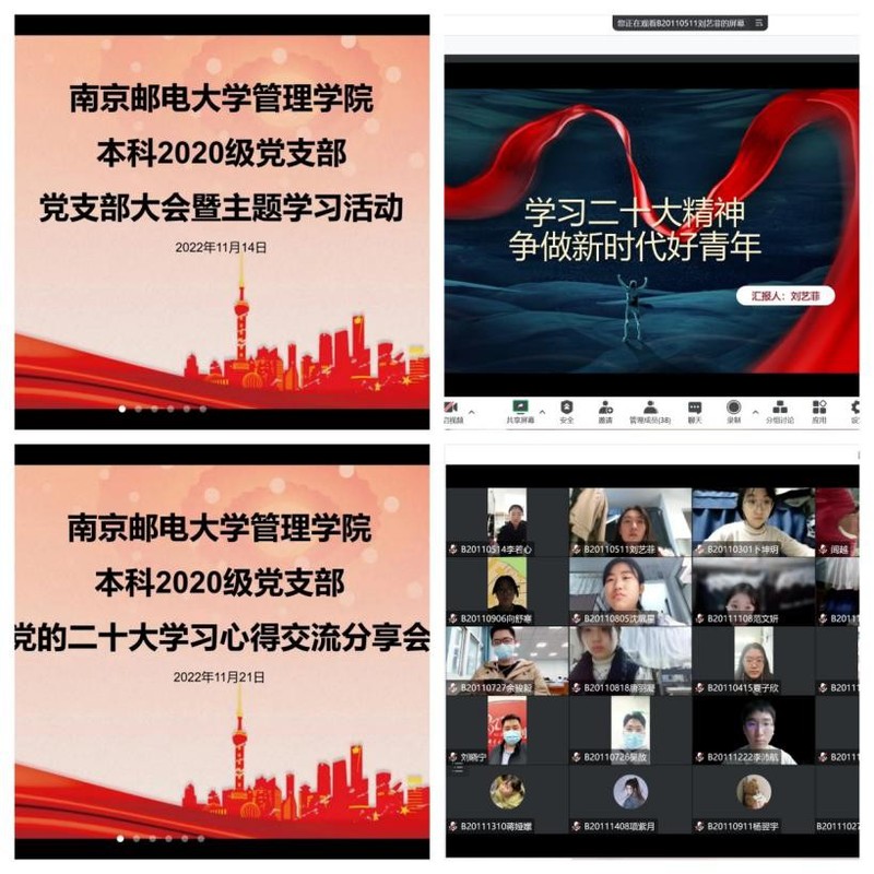 党支部还指导2020级各团支部开展二十大系列活动,各团支部通过学生党员讲党课等方式将党的二十大精神及时宣传至广大青年学生中,财管3班、人管9班等团支部还开展学习二十大知识问答,以知识问答的方式进一步巩固广大团员青年对二十大要点的理解和掌握。11月上旬,党支部指导各团支部积极参加“柚子青年·诵读学传”展示活动,人管7班团支部顺利入选,11月9日,该团支部代表全讯白菜官网全体本科生参加展演,以朗诵的形式发出青年声音、诠释青年担当。此外,党支部选报的学生党员姚瑶顺利入选校第四届优秀学子宣讲团,将代表支部在学生群体中深入开展党的二十大精神的朋辈宣传教育工作。