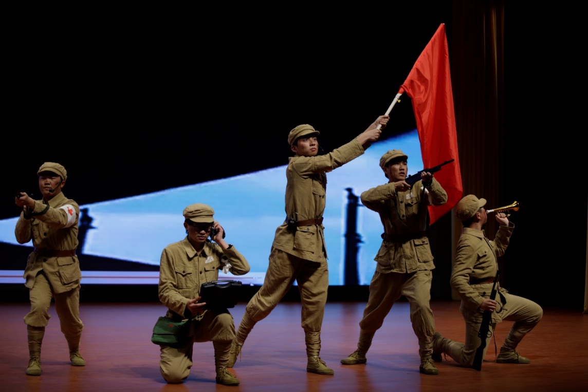 以校史读本《红绿蓝》中通信兵参加解放战争的故事为基,以发生在校史馆里的奇妙邂逅为线,同学们演绎了一群至真至纯的通信战士可歌可泣的顽强抵抗,一场时空交错时同为二十岁青年心贴心的对话,变的是时空,不变的是心中永恒的信仰和“信达天下 自强不息”的赤子之魂!“我记得你,你就活着!”现场,演员们酣畅淋漓的表演献上了一场精彩纷呈的视听盛宴,让不少观众落下了眼泪,赢得阵阵喝彩。