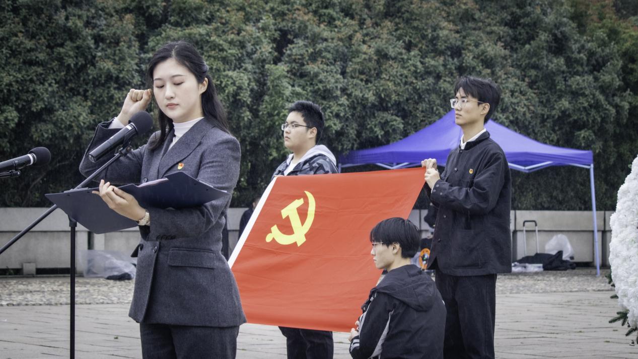 紫金山麓祭英灵,雨花台前吊古今。同学们饱含深情,齐声为雨花英烈诵礼《红色的岁月》,全体党员、团员重温庄严的入党、入团誓词。字字铿锵,句句激扬。在场的每一位党员、团员心中不由地被唤起激荡已久的崇高信仰,责任感和使命感。