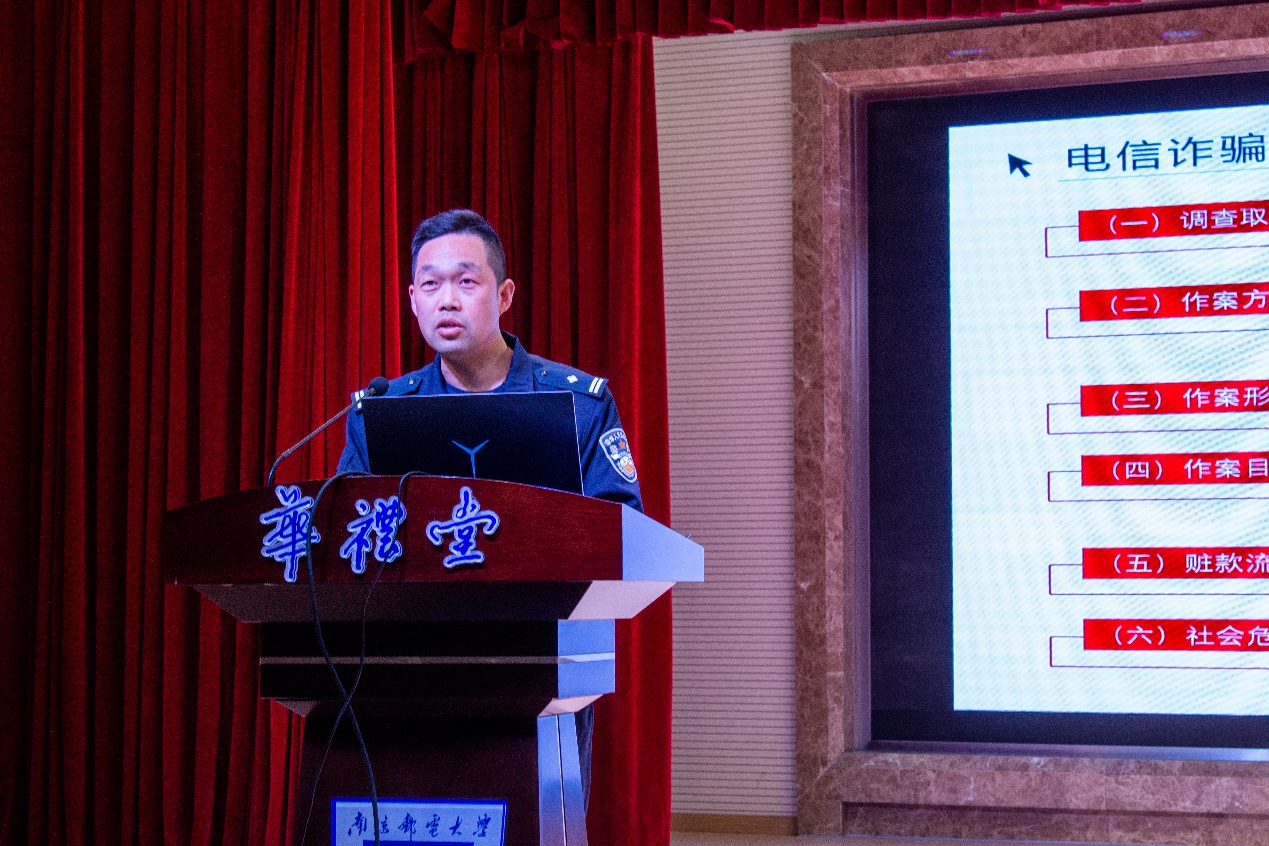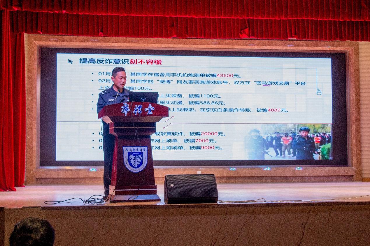 陶警官结合实际的诈骗案例和法律知识,以案说法,深入浅出地向同学们讲解了电信诈骗的特点、哪些人易受诈骗、电信诈骗的种类和防范措施等知识。陶警官向同学们分享了遭遇熟人诈骗、网购诈骗、刷单诈骗等情境时的正确做法,揭露了虚假身份类、利益诱惑类等八类常见的诈骗形式。