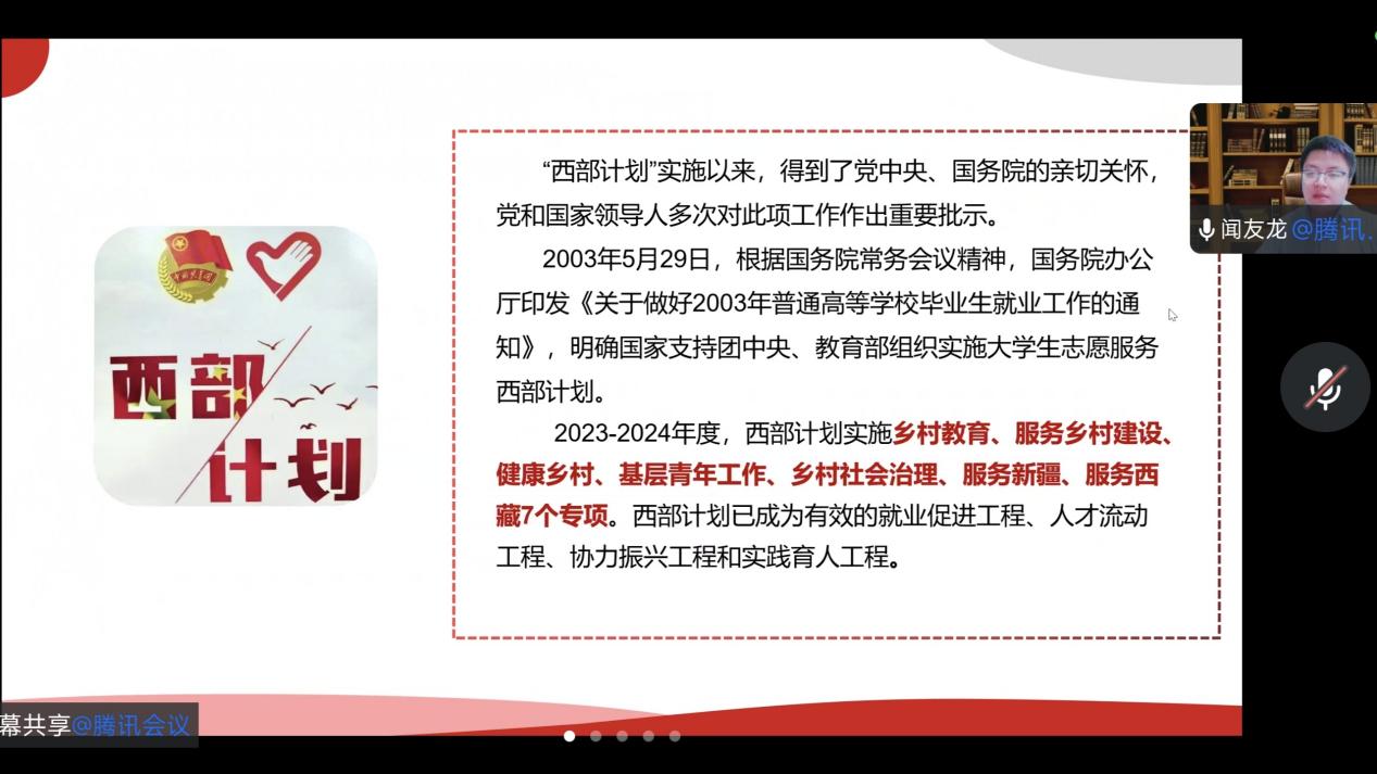为引导广大毕业生前往基层建功立业、助力国家经济社会发展,4月16日晚,002全讯白菜官方网站通过腾讯会议开展2024届基层服务项目专场宣讲会,邀请校团委素质拓展部闻友龙老师进行服务基层项目政策宣讲。学院党委副书记、副院长郭强,分团委书记鲍捷出席宣讲会,2024届毕业班辅导员、意向报名学生及部分家长代表等参与专场宣讲活动。