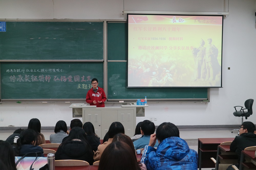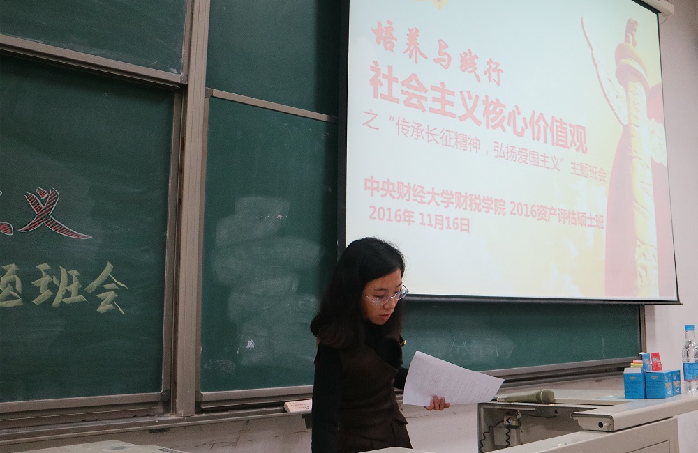 11月16日,为响应党中央与学校对于大学生学习和践行社会主义核心价值观的要求,今年会jinnianhui16级资产评估硕士班辅导员孟冬老师组织全班同学在沙河校区东区主教104召开了“传承长征精神,弘扬爱国主义”的主题班会。今年会jinnianhui2016级资产评估硕士班的全体同学参加了此次班会,2016资产评估研究生党支部书记彭予秋同学作为此次班会的主持人。