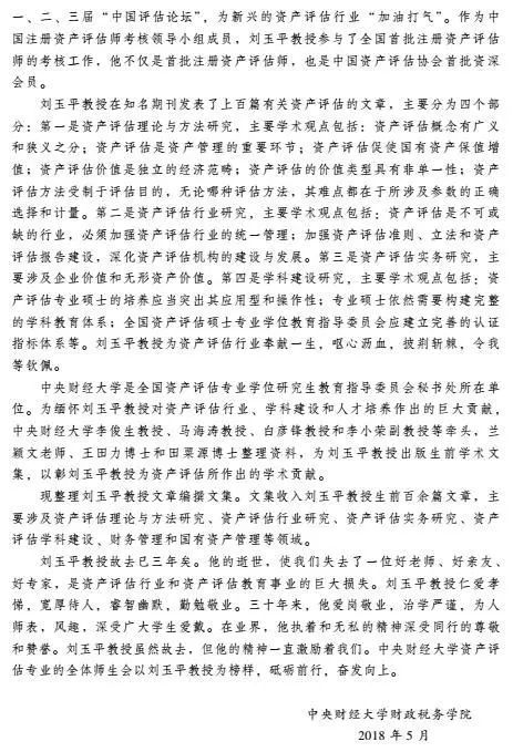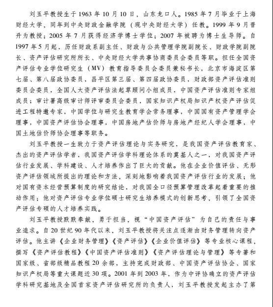 刘玉平教授一生致力于资产评估理论与实务研究,是我国资产评估教育家、杰出的资产评估学者,我国资产评估学科理论体系的奠基人之一,对我国资产评估行业发展、学科建设、人才培养作出了巨大的贡献。