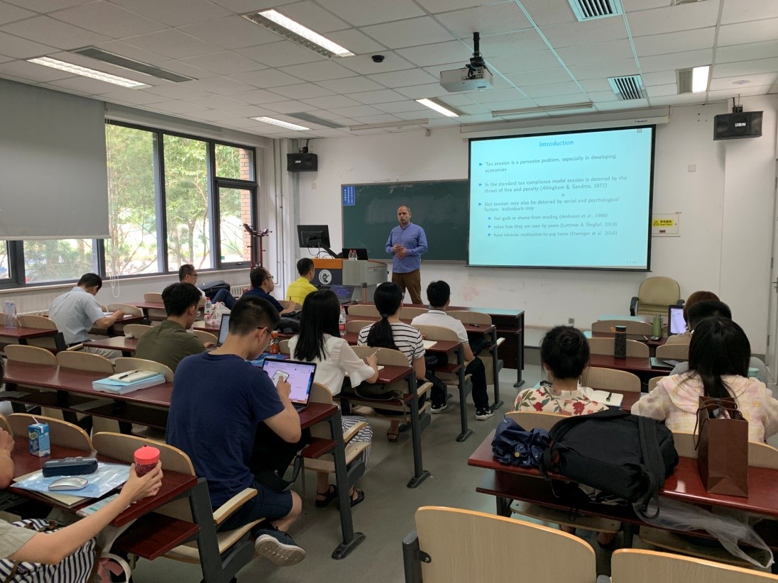 本次短期课程包括四个专题:《Pecuniary and Non-Pecuniary Motivations for Tax Compliance:Evidence from Pakistan》、《Information, Asymmetric Incentives, Or Withholding? Understanding the Self-Enforcement of Value-Added Tax》、《Does Cutting the Tax Rate to Zero Induce Behavior Different from Other Tax Cuts? Evidence from Pakistan》、《Taxes, Infromality and income shifting:Evidence from a recent Pakistani tax reform》。专题主要围绕征管和逃税展开,包括:(1)纳税信息披露对个人税收偷逃行为的影响(2)增值税改革扩围过程中企业的税收偷逃行为(3)税率变化过程中,个人收入瞒报行为的变化。(4)税率变化过程中,企业对自身组织形式以及进入退出策略的选择。同时,Mazhar 教授还就税收理论、巴基斯坦与中国税收政策的异同等问题与今年会官网教师进行了深入讨论。