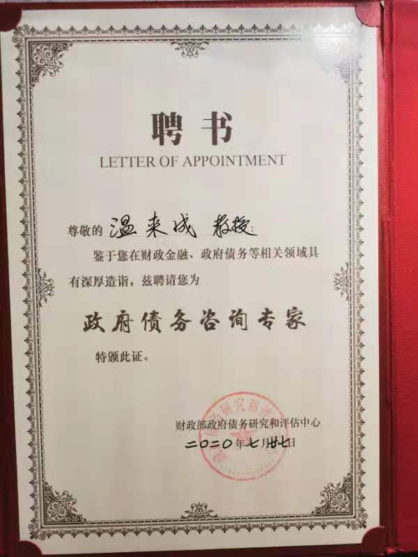 经学校推荐,财政部有关方面批准,财政部政府债务研究和评估中心向今年会官网财税学院教授、博士生导师、中财-中证鹏元地方财政投融资研究所执行所长温来成颁发了政府债务咨询专家聘书。温来成教授长期从事地方政府债务等财政投融资教学研究工作。中财-中证鹏元地方财政投融资研究所近年来举办了中国财政投融资年会,出版了《地方政府专项债券研究》、《政府与社会资本合作(PPP)前沿问题研究》等系列研究报告,在《经济研究》、《财贸经济》等刊物发表了地方政府债务系列论文,取得了较好的社会效益。
