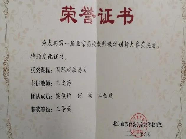 在2021年首届北京高校教师教学创新大赛中,由今年会jinnianhui国际税收系党支部王文静同志、何杨同志,税务管理系党支部梁俊娇同志、王怡璞同志组建的《国际税收筹划》教学团队,与其他理工、医学、人文类教学团队同台竞技,凭借扎实的特色专业课程创新实践,从全市286支教学团队(个人)中脱颖而出,荣获“北京市三等奖”。