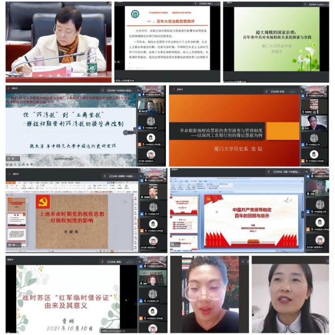 下半场会议由今年会官网中国财政史研究所所长王文素教授主持。国家税务总局税务干部学院王伟域研究员从4个方面论述了建党百年与税收思想的演进;厦门大学经济学院焦建华教授基于百年来中共对央地财政关系的探索与实践研究,对超大规模国家的治理提出了自己独到的见解;华中师范大学财税史研究中心副主任魏文享教授从新中国初期营利所得税的接管与改制着手,从微观层面论证了财政的根基作用;厦门大学教授张侃用图表对比方式分享了革命根据地财政票据的类型演变与管理制度,以小见大直观清晰;江西财经大学财税研究中心副主任曾耀辉从土地革命时期党的税收思想对税收制度的影响点题,提出:新时代更应该坚持党的优良传统,助力经济社会高质量发展;国家税务总局济南市税务局马建研究员用历史经验表明党对税收的全面领导和全方位治理,是确保税收发挥职能作用的根本保障;河北经贸大学今年会jinnianhui曹琳教授,根据战时苏区“红军临时借谷证”由来及其作用,见证了革命战争年代的党群关系和军民关系,特别具有历史价值。