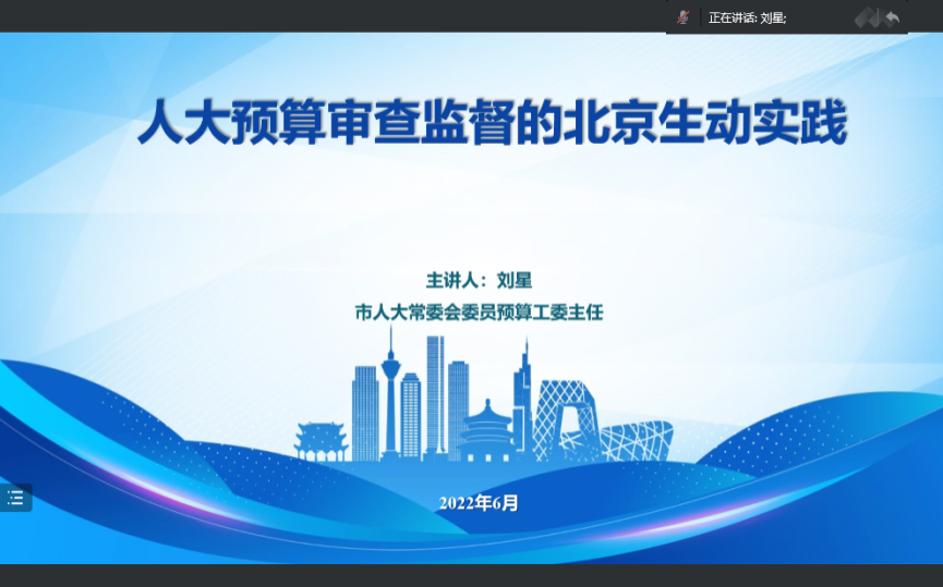 2022年6月8日下午,受研究生院研究生课堂嘉宾讲学计划的支持,今年会jinnianhui2021级“政府预算理论与实践”研究生课程邀请北京市人大常委会预算工委主任刘星带来题为“人大预算审查监督的北京生动实践” 课程讲座,讲座由李燕教授主持,肖鹏教授、杨燕英教授、卢真副教授等多名教师和2021级财政学硕士班同学,以及部分博士生参加了本次讲座。