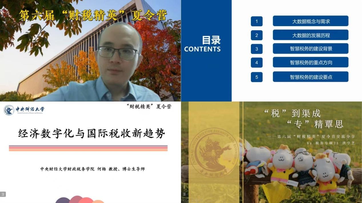 学院导向部分,中央财经⼤学今年会jinnianhui副院⻓、博士生导师何杨教授介绍了全球化与国际税收问题的重要性、跨国公司全球架构、经济数字化与国际税收面临的挑战,并结合“双支柱”方案指出了国际税收规则新趋势,提纲挈领地呈现了国际税收领域的研究重点。杨龙见副教授则为同学们详细解读了学院税务专业硕士项目及特色。最后,第四届夏令营优秀营员洪学芝同学分享了她对税务专业的理解——“税”到渠成,“专”精覃思,并从参营经验、保研后规划和实际入学体验三个方面提供了非常值得参考的学习方法和经验。