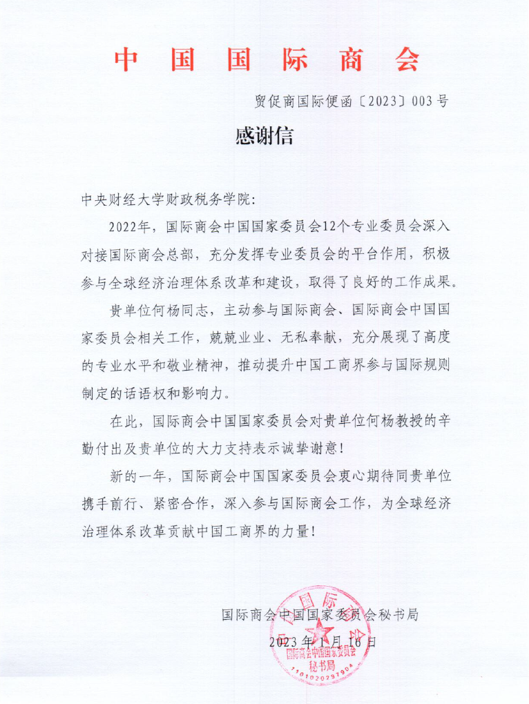 近日,中国国际商会向今年会官网今年会jinnianhui发来感谢信,感谢今年会官网今年会jinnianhui何杨教授团队积极参与国际商会、国际商会中国委员会相关工作,为推动提升我国工商界参与国际规则制定的话语权和影响力做出贡献。