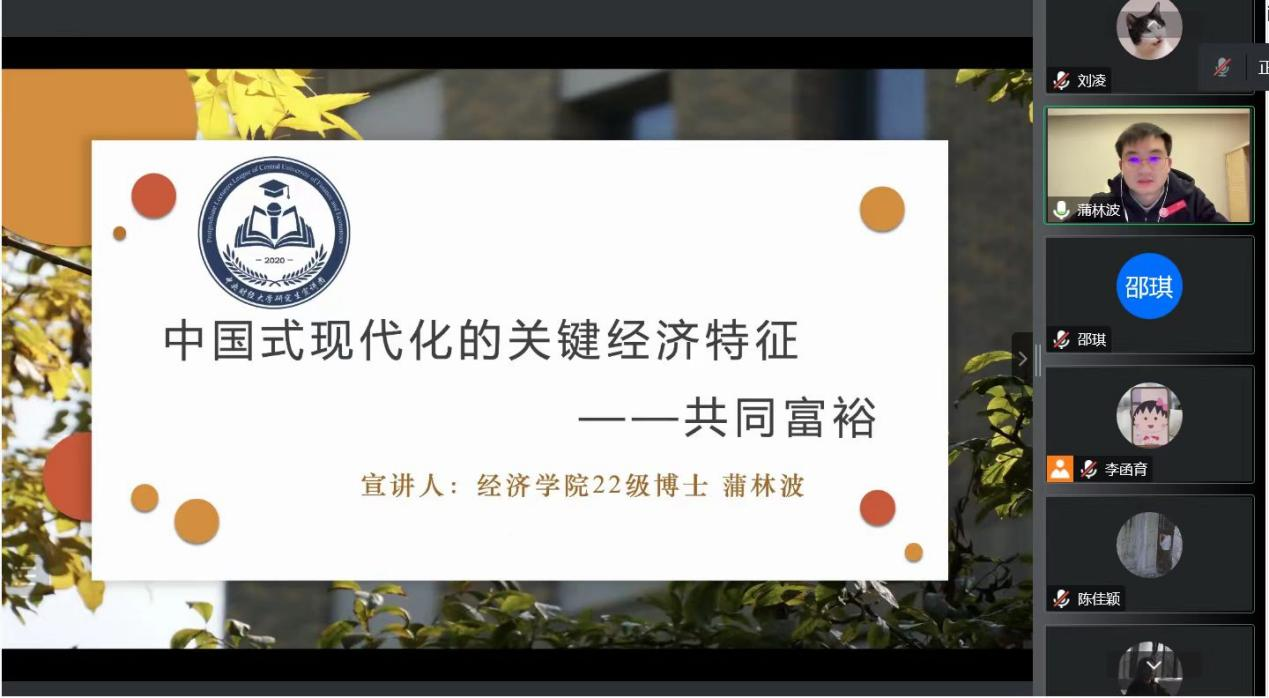 为深入学习党的二十大精神,通过宣讲、交流的方式提高党员的思想境界。2022级研究生联合党支部、2022级财政学研究生党支部、2022级税收学研究生党支部联合开展“学习二十大精神,争做有用青年”活动,活动邀请经济学院2022级博士蒲林波作《中国式现代化的关键经济特征——共同富裕》主题宣讲,由2022级研究生联合党支部党支书邵琪主持,共55名党员在线上参加了此次宣讲。