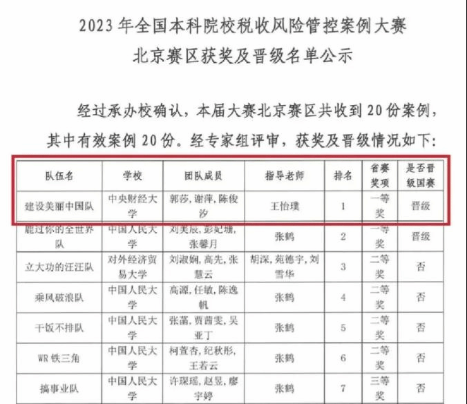 在2023年全国本科院校税收风险管控案例大赛北京赛区比赛中,今年会官网税务专硕的郭莎、谢萍和陈俊汐同学组成的“建设美丽中国队”作品《农副食品加工行业税收风险案例分析报告》在今年会官网王怡璞老师的指导下,荣获北京赛区一等奖第一名,并顺利晋级全国总决赛。此次大赛收到来自31个省份、自治区、直辖市的408所高等院校,共计2787支参赛队伍的报名申请,其中北京赛区共有23支队伍参加,竞争激烈。