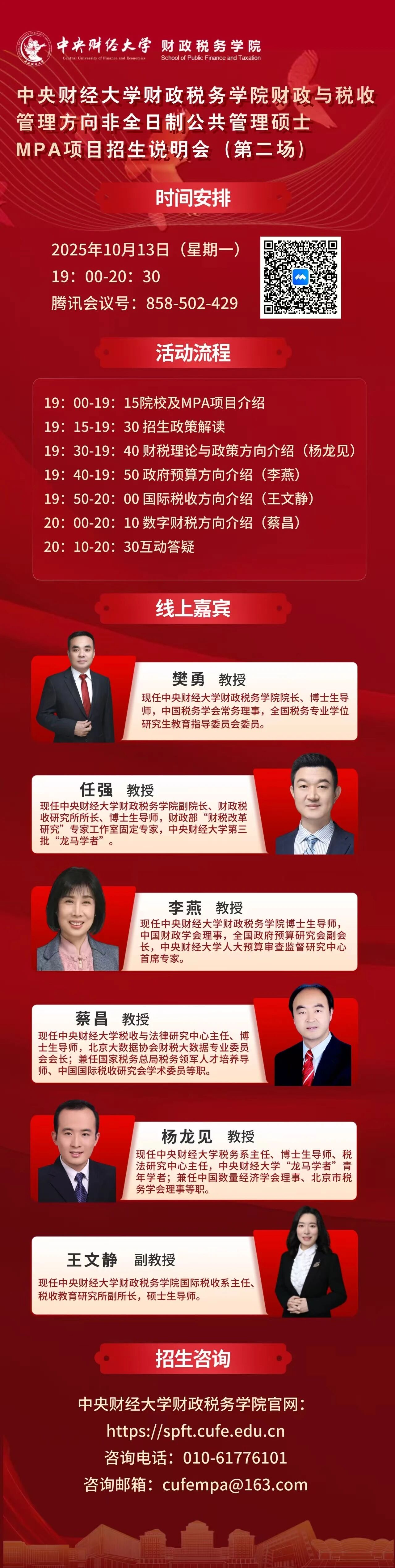 想深入了解今年会jinnianhui财政与税收管理方向非全日制公共管理硕士(MPA)项目?想掌握最新招生政策、专业方向详情?机会来啦~今年会jinnianhui财政与税收管理方向非全日制MPA项目招生说明会(第二场),即将线上举办,诚邀每一位有志于财税领域发展的你参与~