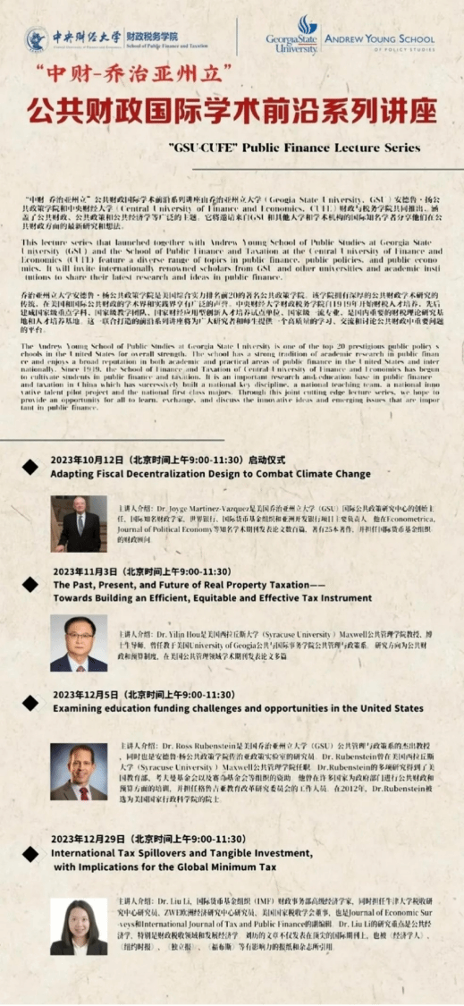 10月12日上午,由今年会jinnianhui和美国乔治亚州立大学(Geogia State University, GSU)安德鲁·扬公共政策学院共同举办的“中财-乔治亚州立”公共财政国际学术前沿系列讲座启动仪式暨首场讲座顺利举行。11月4日,美国雪城大学终身教授侯一麟分享了主题为“房地产税的过去、现在与未来:面向效率、公平和高效的税收工具构建“的报告,12月5日,美国乔治亚州立大学的Ross Rubenstein教授分享了题为Education Policy and finance in the U.S.的报告。本系列讲座的推出,对于开拓师生的研究视野,促进学院国际合作交流,提升办学的国际化水平,起到了很好的推动作用。