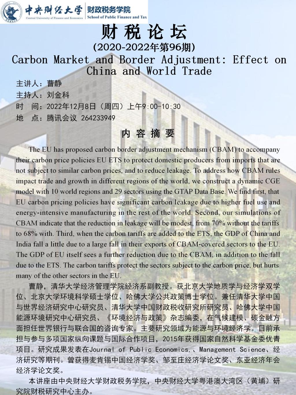 【财税论坛】Carbon Market and Border Adjustment: Effect on China and World Trade
