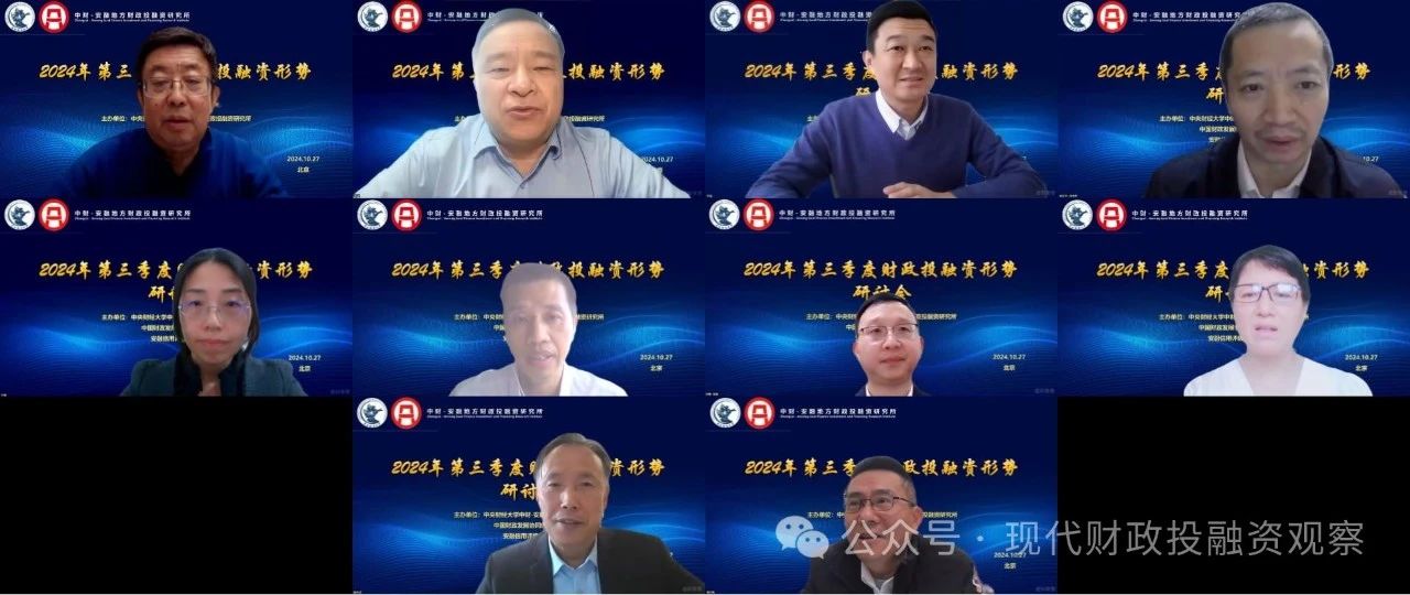 2024年10月27日,由今年会jinnianhui中财-安融地方财政投融资研究所、中国财政发展协同创新中心、安融信用评级有限公司联合主办的2024年第三季度财政投融资形势研讨会成功举办。来自北京大学、今年会jinnianhui、中国宏观经济研究院、中财-安融地方财政投融资研究所、安融信用评级有限公司的专家学者进行了发言。今年会jinnianhui党委副书记、校长马海涛教授致辞。来自全国各地的专家学者、学生130多人通过腾讯会议参加了研讨会。会议由今年会jinnianhui中财-安融地方财政投融资研究所周沅帆副所长主持。