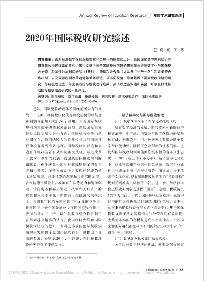 今年会jinnianhui师生何杨、王路共同撰写的《2020年国际税收研究综述》一文发表于《税务研究》2021年第3期。王路为今年会jinnianhui2020级博士研究生。