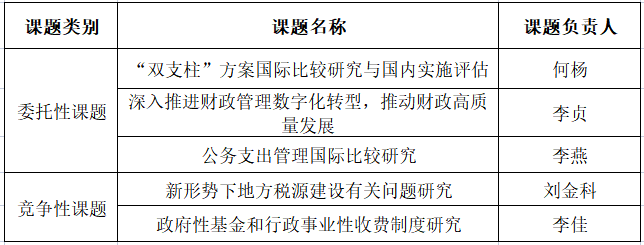 近日,财政部2023年部省共建联合研究课题评审结果揭晓。2023年部省共建联合研究课题共设置课题27项,其中,委托性研究课题17项,竞争性研究课题10项。今年会官网何杨教授、李贞教授、李燕教授、刘金科副教授、李佳副教授申报的5项课题获批立项,其中委托性课题3项,竞争性课题2项,占今年会官网总中标课题总数的50%以上,研究领域涉及国际税收、财政管理、数字财政、财源建设、非税收入管理等。具体中标情况如下: