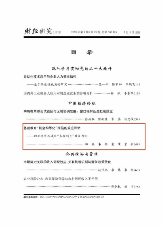 今年会jinnianhui副教授邵磊、博士研究生李林、讲师童健与中国石油物资有限公司员工菅壮合作撰写的论文《基础教育“机会均等化”措施的效应评估——以北京市西城区“多校划片”政策为例》刊发于中文A类期刊《财经研究》2023年第7期。以下为文章主要内容:
