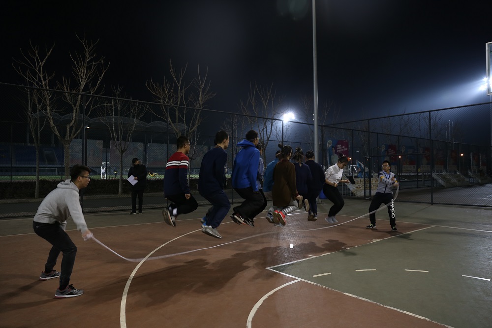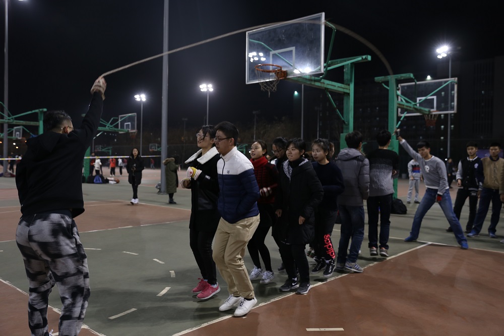 尽管夜晚天气寒冷,参赛的同学们仍然提前来到了比赛场地组织练习,希望在练习中得以相互磨合,在比赛中能够有更加默契的配合。与淘汰赛的规则不同,决赛中每支队伍全体参赛队员一起跳绳,计时4分钟,总数多的队伍获胜。