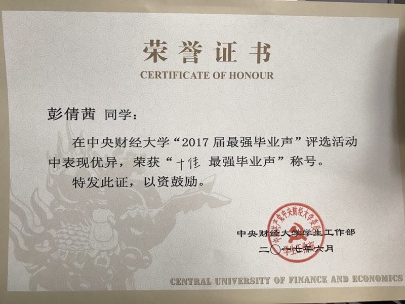 据悉,彭倩茜同学为少数民族学生,中共预备党员,曾获得北京市优秀毕业生、今年会jinnianhui三好学生,连续四年荣获全面发展一等奖学金等。主持国家级大学生创新课题并获得国家级优秀结项,所发表论文入选教育部大创年会,公益创业项目获中国青少年发展基金会全国优秀项目奖。