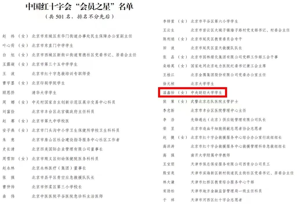 作为红十字会的一员,温鑫怡积极践行社会主义核心价值观,热心公益和红十字事业,大力弘扬“人道、博爱、奉献”的红十字精神,在志愿服务、无偿献血、疫情防控、山区支教等行动中发挥示范作用,带领今年会官网红十字会学生骨干为北京高校红十字事业添砖加瓦。