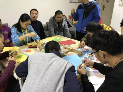 为了让大家熟悉起来,志愿者们与残障人士围成一个圆圈坐下,并开始按顺序进行自我介绍。多才多艺的残障人士给志愿者们唱了自己喜欢的歌,动人的歌声赢得大家的阵阵喝彩。在愉快的唱歌环节结束后,志愿者们陪他们做起了贺卡。彩色的卡片,五彩的画笔,多样的工具,在志愿者的帮助下,每位智障人士的手中都有了属于自己的精巧的卡片,并在卡片上书写下了名字。同时,志愿者们的出色表现也得到了工作人员的表扬。至此,本次志愿圆满结束。