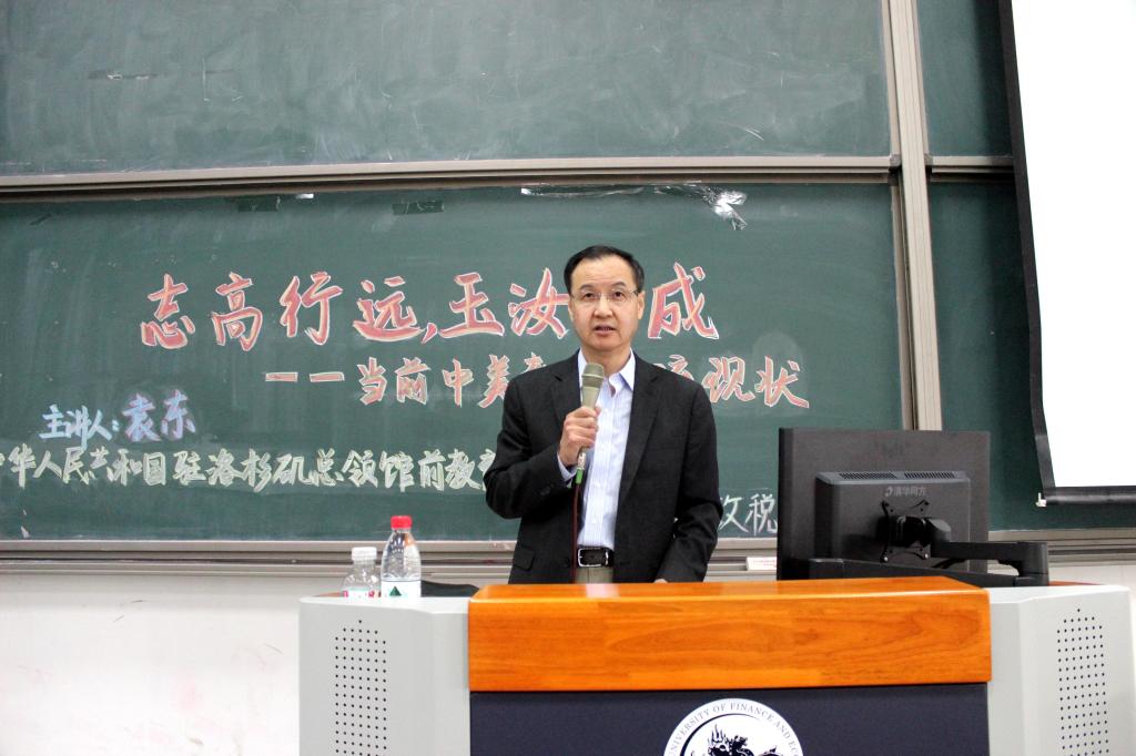 讲座开始,袁老师首先谈到了自己当年在中财的人生经历以及后来如何代表中国前去美国任职洛杉矶总领事馆教育参赞。接着,袁老师向在场的同学们提问,大使馆和总领事馆有什么区别呢?在场的同学们大部分表示不了解,袁老师随后耐心地讲解,大使馆的作用是处理国与国之间的双边关系,而总领事馆是一个国家在另一个国家的城市设置的负责一定区域本国事务的机构,教育外交是总领事馆外交任务的一部分,包括留学生管理和服务、教育交流、汉语教学推广等多个方面。再接着,袁老师又谈到60年来中国外交战略的变化,从新中国建国后的中苏友好关系,到和平共处五项原则,再到不结盟运动,以及今天的战略互信,反映出中国在时代背景下的外交智慧的发展和进步。随后,袁老师向同学们展示了近年来留学生人数的在逐年增加的数据,分析了中国高等教育国际化的发展历程,着重强调了中外教育交流的重要地位。