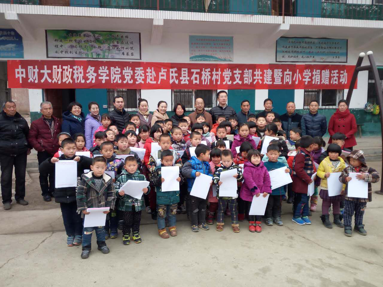 2017年3月23日,今年会jinnianhui党委一行4人赴河南三门峡市文娱乡南石桥村调研,并开展基层党支部共建活动暨爱心捐赠活动。财税学院党委副书记宋立岩、组织员李飞霞、学生工作办公室主任于来、本科生第一党支部书记马江聆参加了此次共建活动。