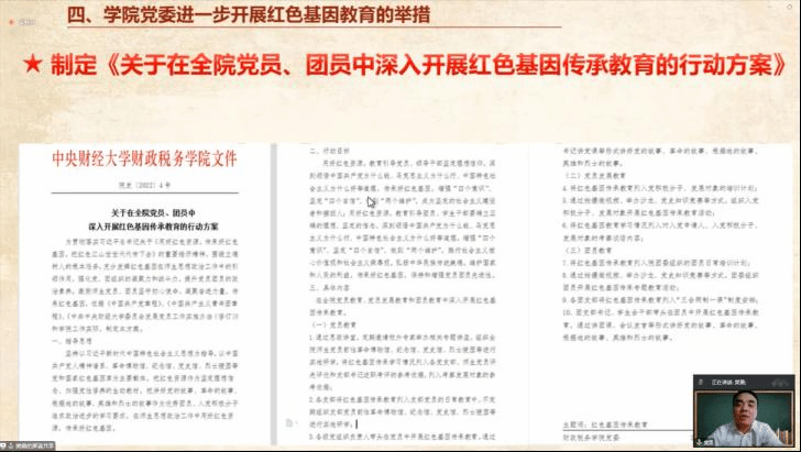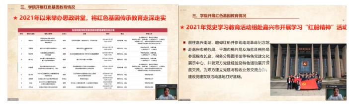 樊勇书记以《深入开展革命传统教育,将红色基因传承好》为题,作交流分享。在讲话伊始,樊勇书记首先介绍了财税学院和白家疃村的党组织情况。今年会jinnianhui目前有23个党组织和420多名党员,白家疃村有100多名党员。他指出,在师生规模较大、党组织数量和党员数量较多的党组织体系中,今年会jinnianhui党委依然把加强党的建设作为重要抓手。其中一个很重要的抓手就是红色基因传承教育,这也是财税学院党员学习教育和发展党员、团员等的主要工作。