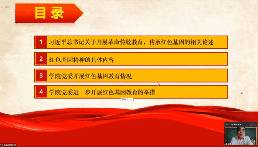樊勇书记首先梳理了近些年来习近平总书记关于红色基因传承的重要论述。接着,对红色基因精神中的“建党精神”“延安精神”“井冈山精神”“长征精神”“西柏坡精神”五种精神进行了详细解释,每一个精神都反映出我们共产党员优秀品质和党组织的先进性。而后,樊勇书记介绍了学院党委开展红色基因教育情况,回顾2021年党史学习教育活动组赴嘉兴市开展学习“红船精神”活动,以及2021年以来举办的9次以红色基因传承教育为主线的思政讲堂,表达了将红色基因传承教育走深走实的希望。