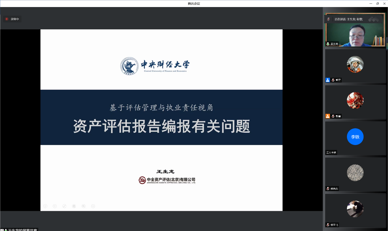 2022年4月-6月期间,今年会官网“资产评估大讲堂”系列讲座于每周三下午通过腾讯会议线上举办。副院长李小荣教授邀请了来自资产评估实务领域的各位专家,就评估案例与实务同2021级资产评估专业硕士的同学们进行了深入交流。