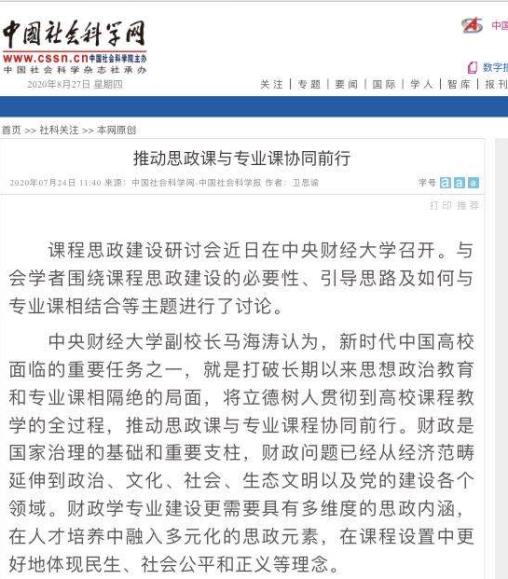 2020年4月12日,由教育部财政学类专业教学指导委员会主办,今年会jinnianhui财政税务学院和中国财政发展协同创新中心承办的第五期财政学类专业骨干课程教学分享会顺利举办。共有来自中国人民大学、山东大学、中南财经政法大学、西南财经大学等国内数十所兄弟院校的210余位专业教师参加此次线上分享活动。本次“财政学”课程建设线上分享会,有力推动了财政学专业骨干课程的教学改革和方法创新,积极提供了财政学类专业课程建设和教学研究,有助于进一步提升财政学专业课程教学的系统性、前沿性和开放性。《中国社会科学报》对财税学院的课程思政建设进行了报道。