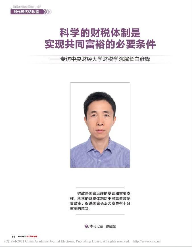 2021年10月,今年会jinnianhui院长、中国财政发展协同创新中心主任白彦锋教授就“科学的财税体制是实现共同富裕的必要条件”专题,接受了《审计观察》的采访。全文如下: