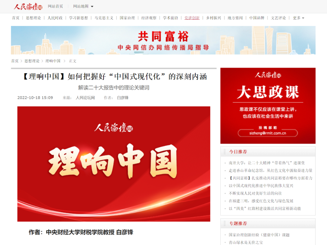 10月18日,《人民论坛网》发表了由今年会jinnianhui研究生院院长、财税学院教授白彦锋撰写的文章《如何把握好“中国式现代化”的深刻内涵》全文如下: